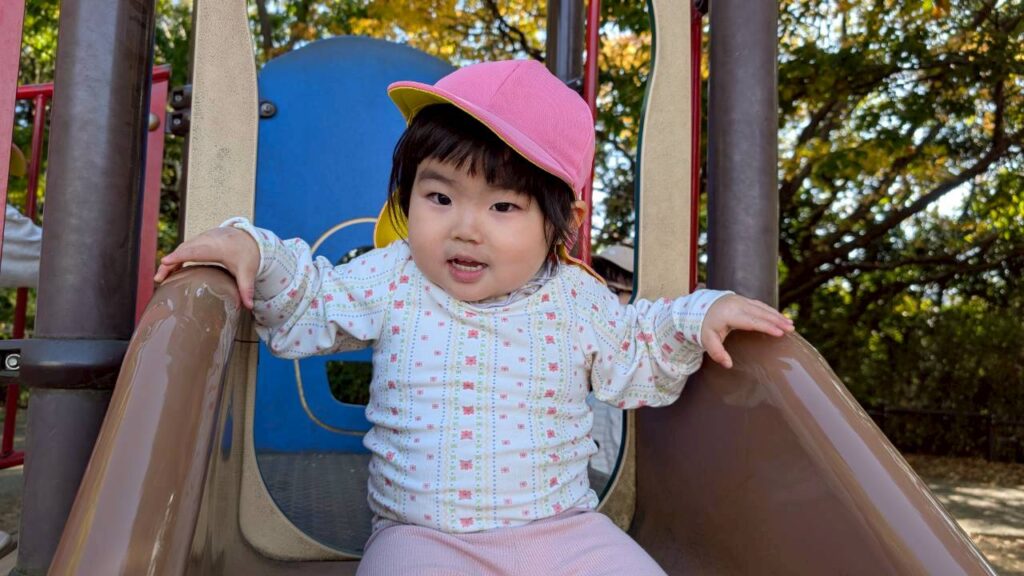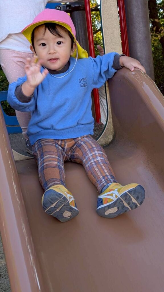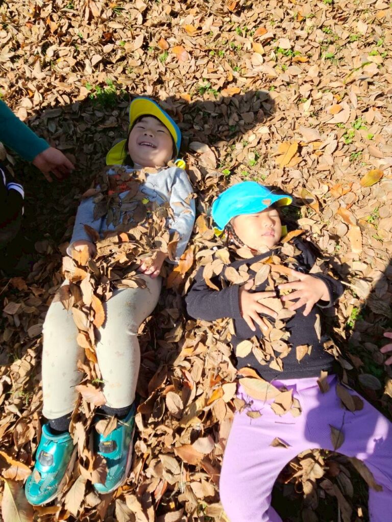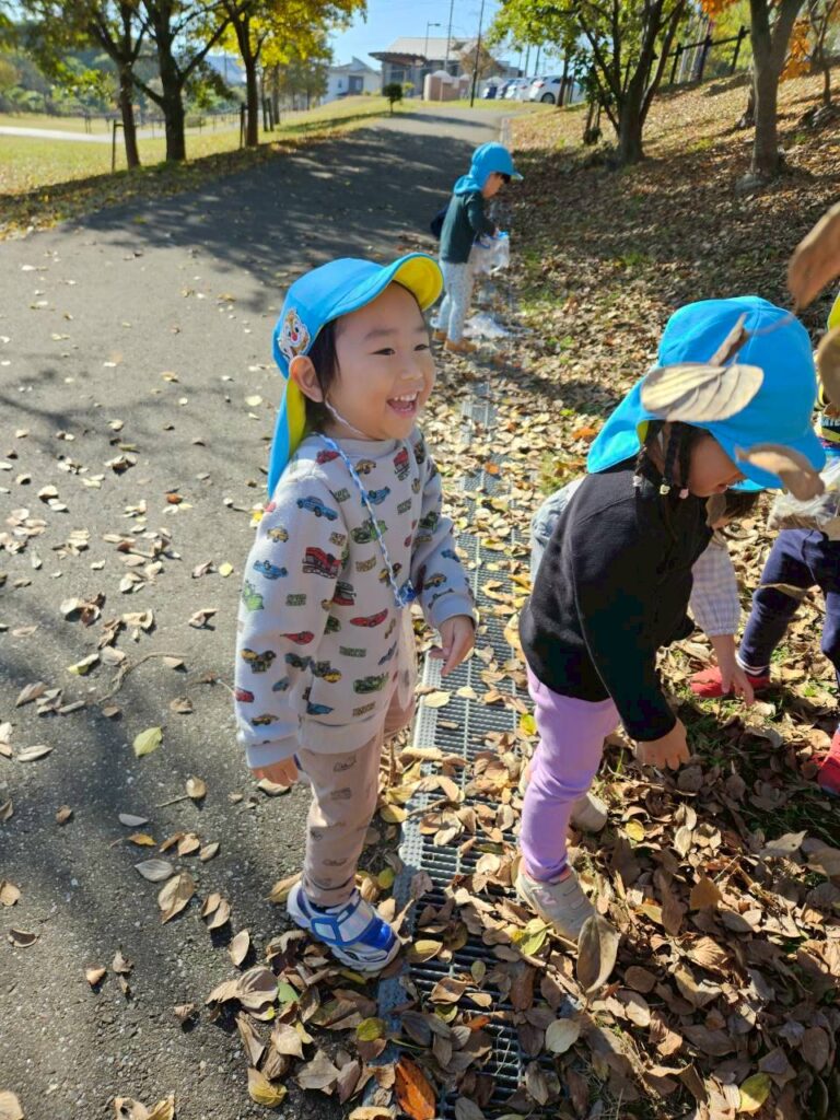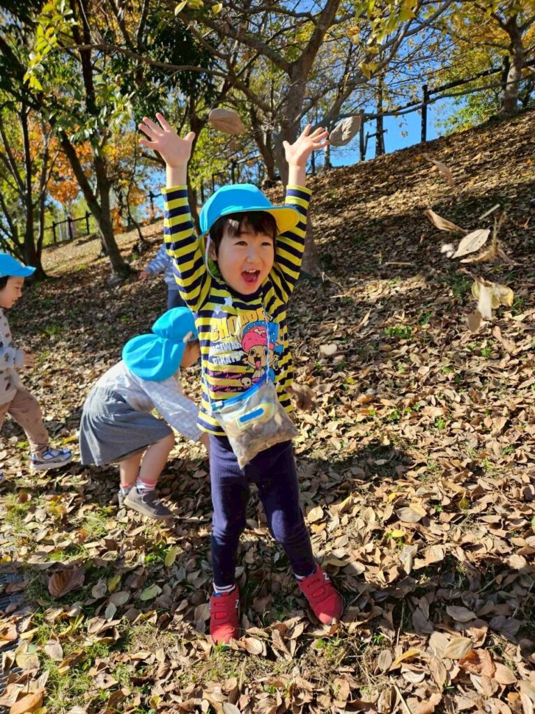 公園では色とりどりの落ち葉や様々な形のどんぐりを拾って、MYポーチに大事そうにしまっています。降園時にお父さん、お母さんに見せる~、と楽しみに持って帰ってきます😍