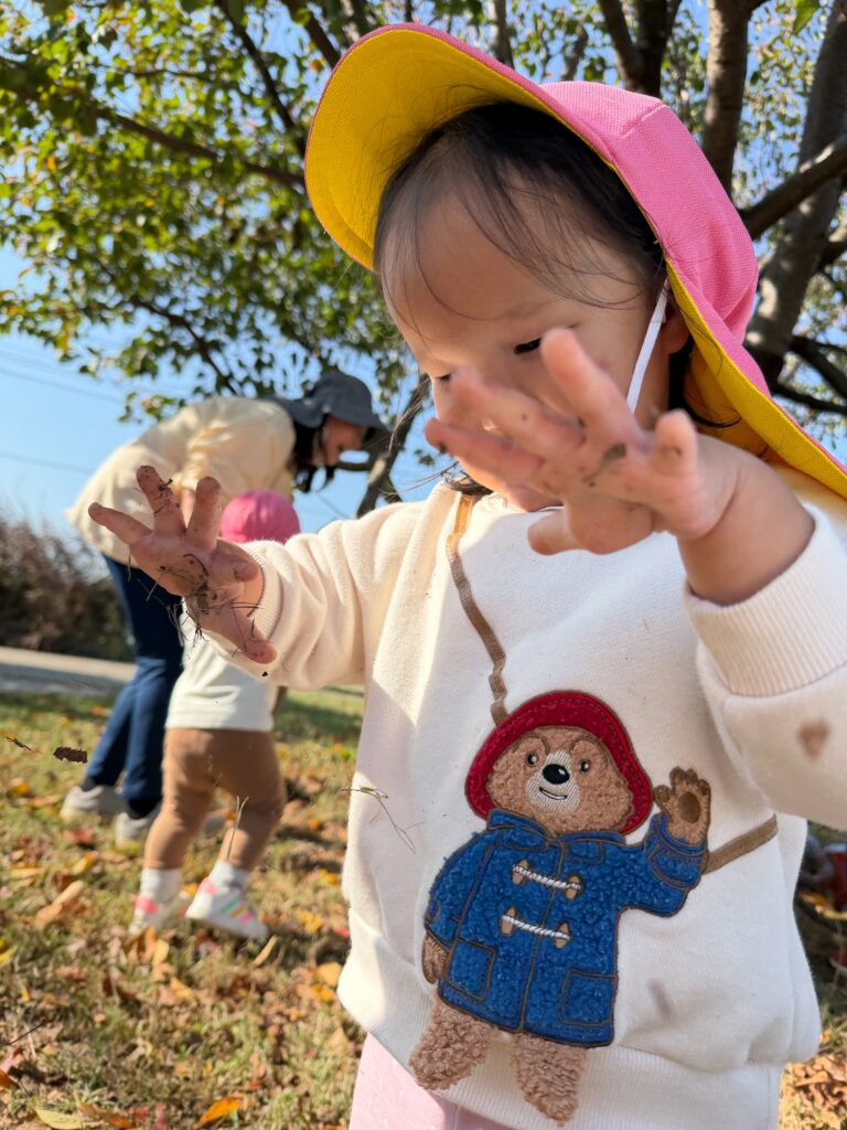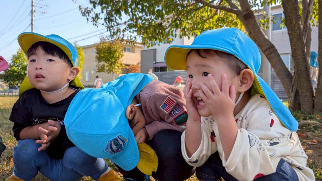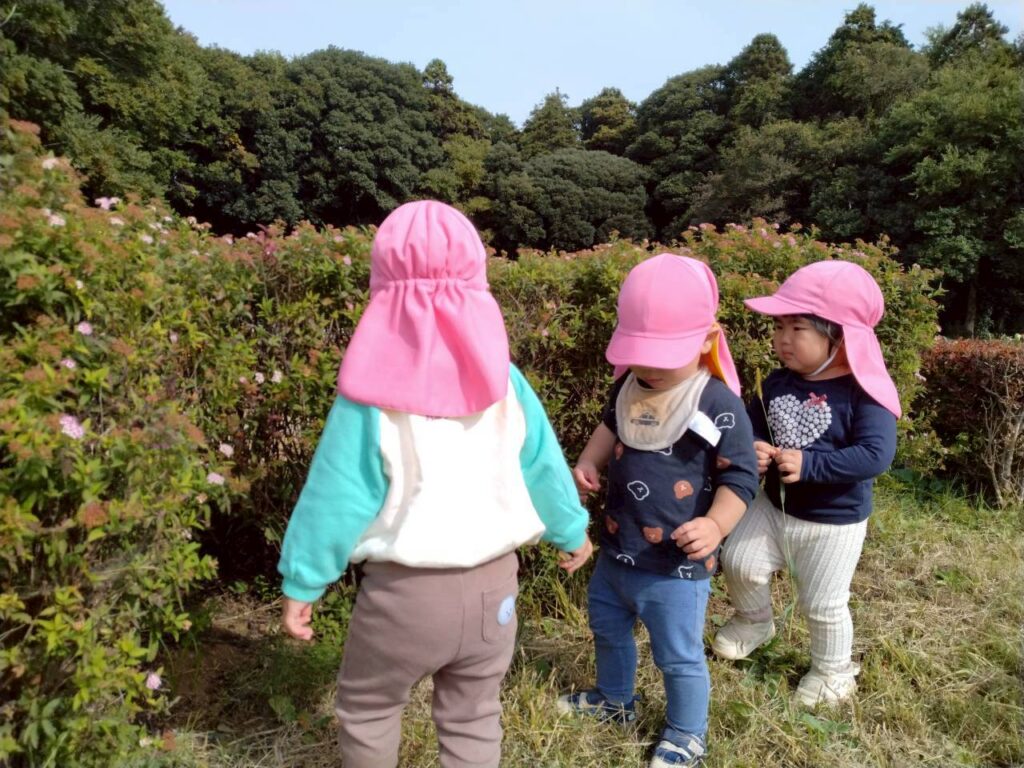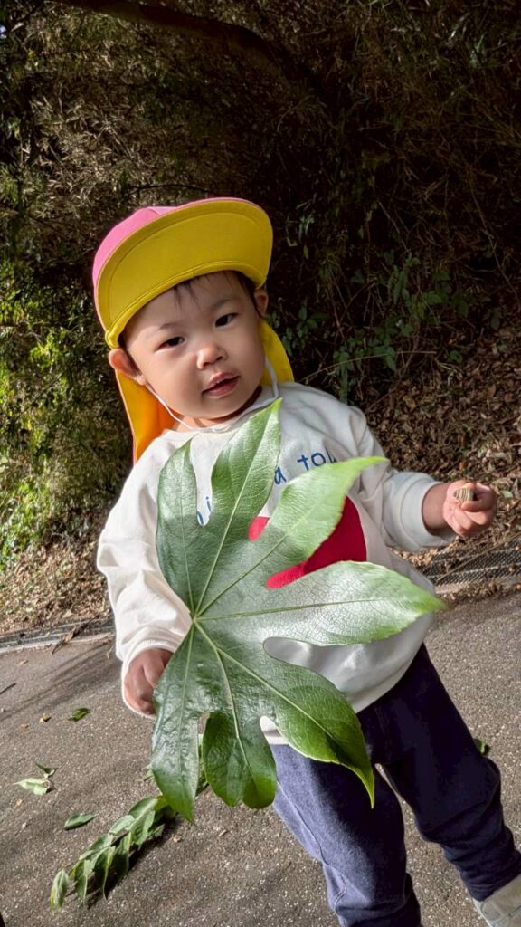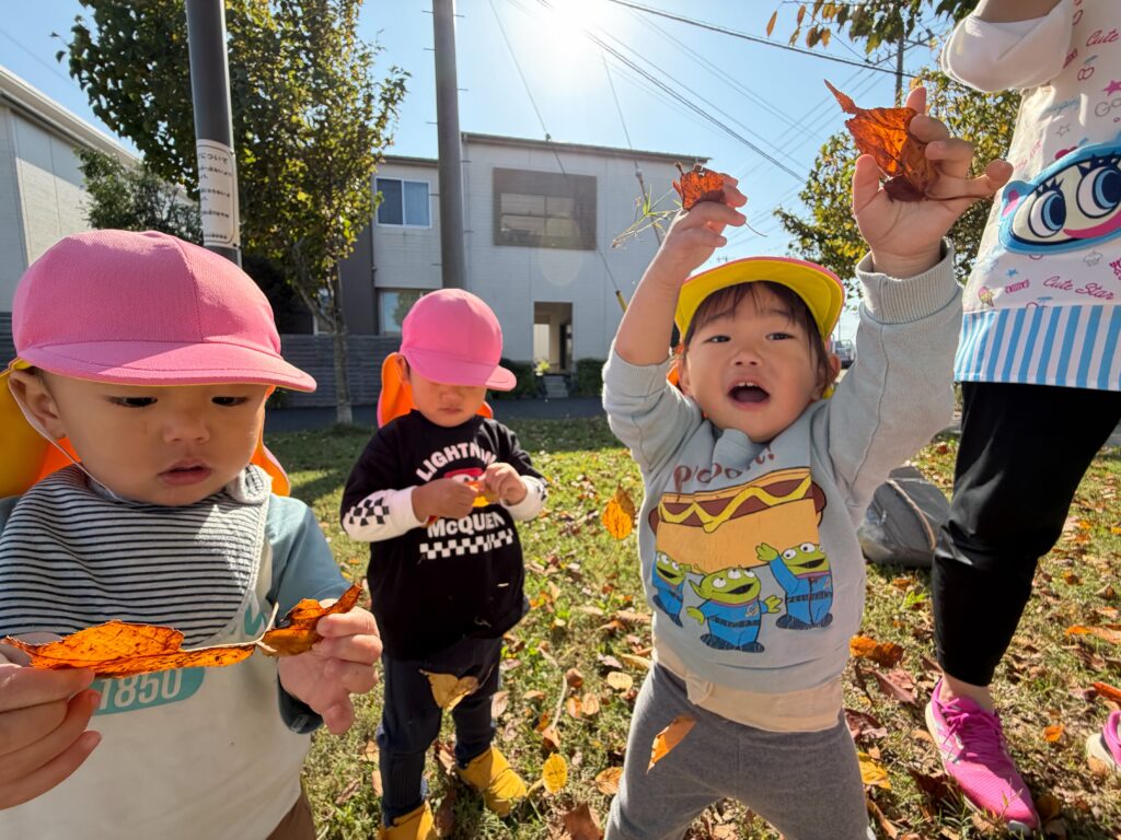 公園では色とりどりの落ち葉や様々な形のどんぐりを拾って、MYポーチに大事そうにしまっています。降園時にお父さん、お母さんに見せる~、と楽しみに持って帰ってきます😍